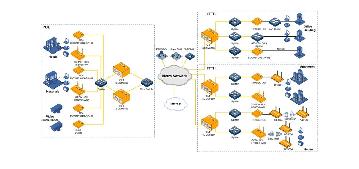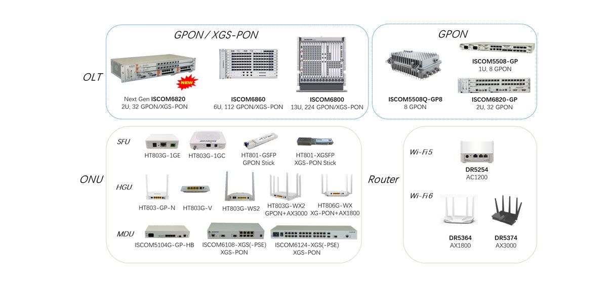Dispone de OLT basadas en chasis de alta, mediana y baja capacidad, así como varios tipos de ONT, incluidos SFU, MDU y HGU para todo tipo de escenarios.